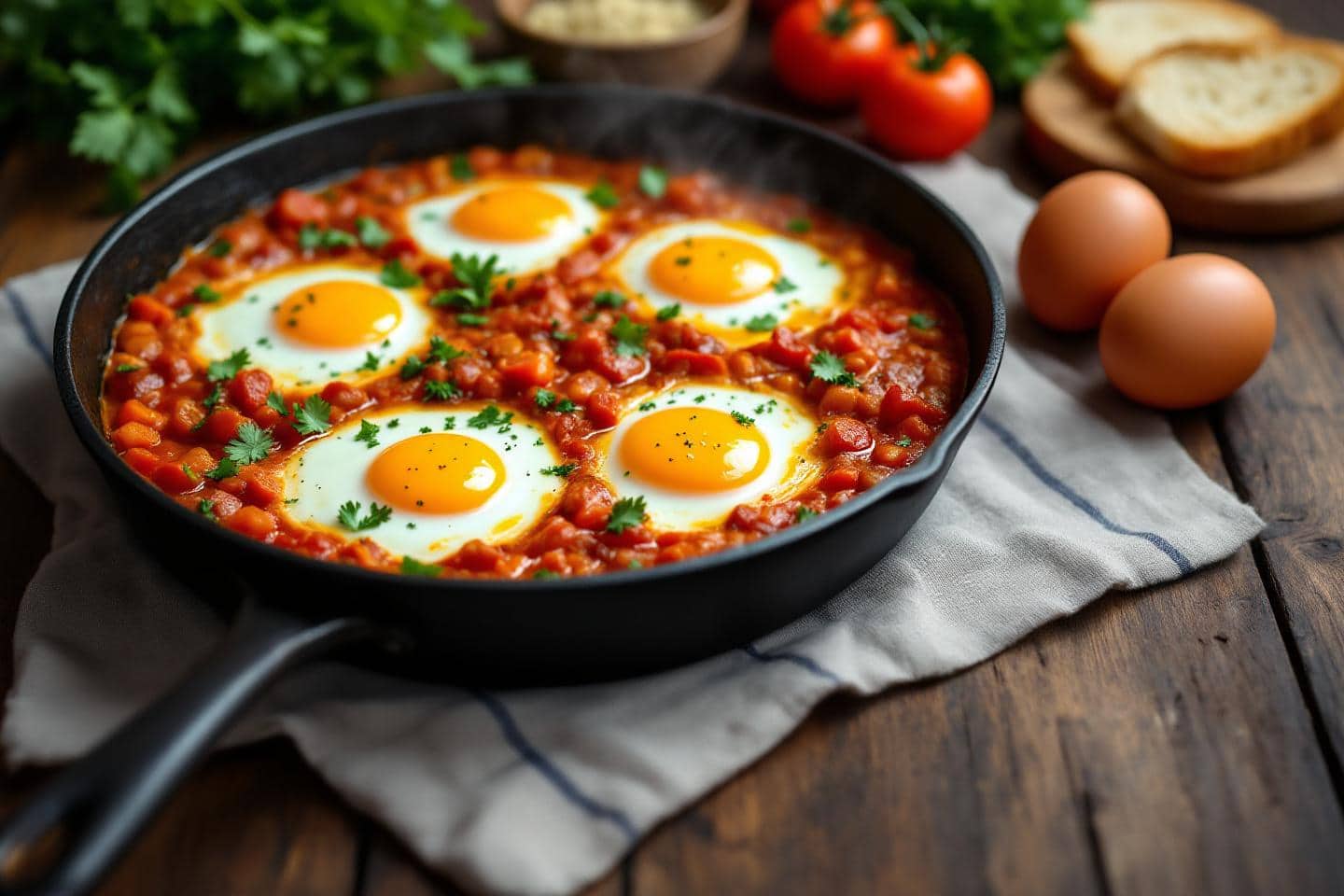 Lorsque la sauce a épaissi et embaumé la cuisine, creuser de petits nids avec le dos d’une cuillère. Casser délicatement les œufs un à un dans ces creux, sans abîmer le jaune. Couvrir aussitôt : la chaleur diffuse permet d’obtenir un blanc tout juste pris et un jaune qui reste coulant. Il suffit de 7 à 9 minutes pour obtenir cette texture parfaite, soyeuse et gourmande à souhait.