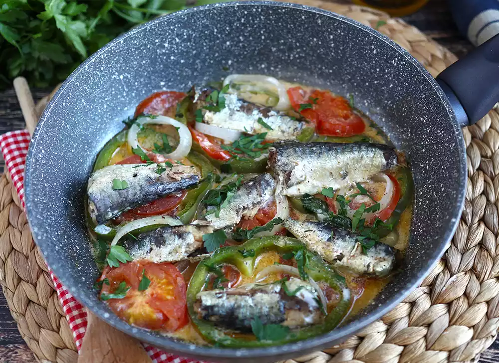 Mettre un peu d'huile (de la boîte de sardines) dans la poêle. Coupez le poivron, les tomates et l'oignon en rondelles. Placez ces ingrédients dans une sauteuse, les uns sur les autres, en alternant. Ajoutez les sardines par-dessus. Assaisonnez avec une pincée de sel et quelques gouttes de tabasco.