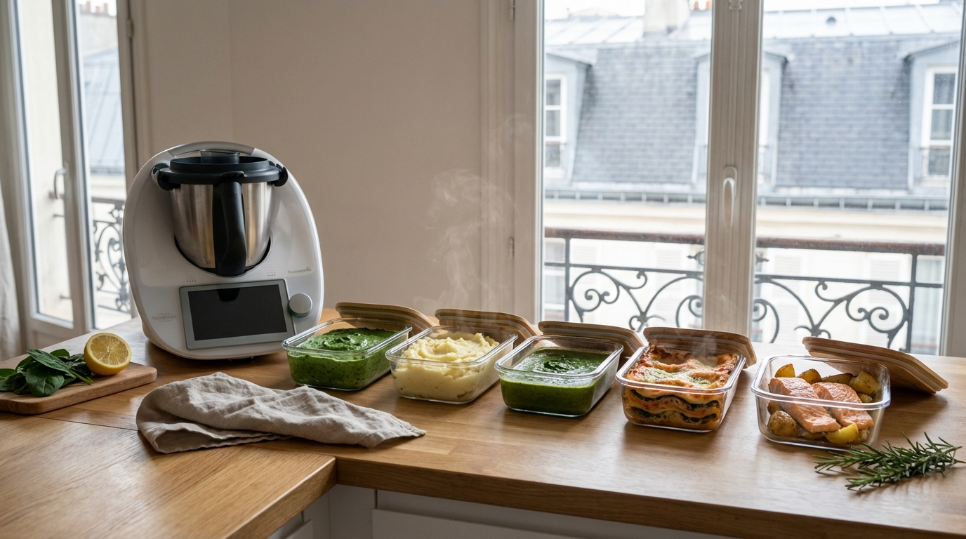 La grisaille de février s’installe et les soirées défilent, entre travail, devoirs et envie de se poser. Pour éviter de passer chaque nuit devant les casseroles, une session de batch cooking au Thermomix permet de régler tous les dîners de la semaine du 9 février en une seule fois, avec un même trio d’ingrédients fil rouge.