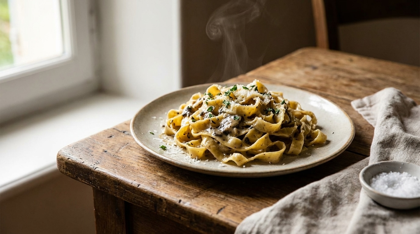 Pour une version plus hivernale et réconfortante, une crème de noix et champignons s’accorde parfaitement avec la rusticité de cette recette maison. Des champignons de Paris ou des pleurotes sont poêlés vivement avec de l’ail, avant d’être liés avec une crème épaisse onctueuse et des cerneaux de noix concassés. Cette sauce nappe généreusement les lanières de pâte, apportant des notes de sous-bois et de terre qui réchauffent instantanément le palais.