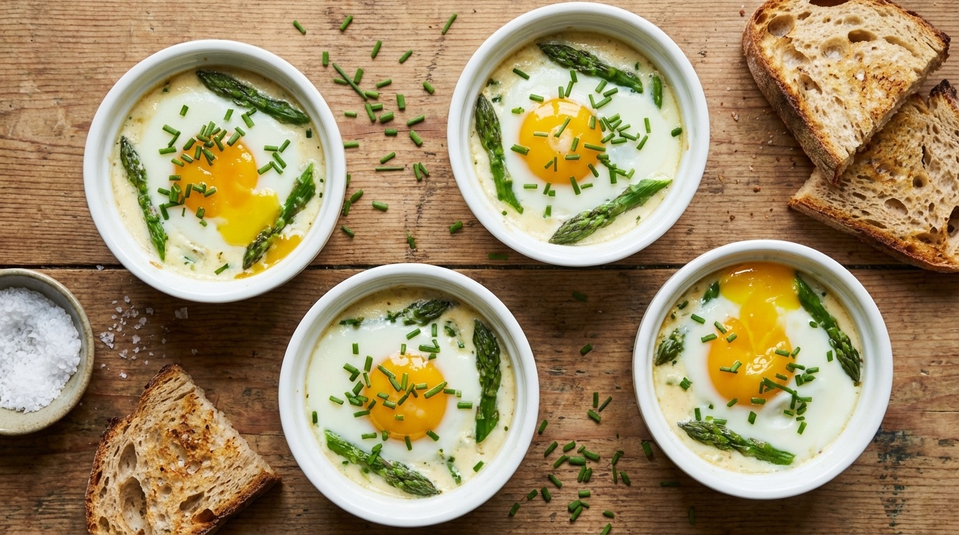 Ces œufs cocotte aux asperges se dégustent dès la sortie du four, encore frémissants, accompagnés de mouillettes de pain grillé qui plongent dans le jaune. On peut les parsemer de ciboulette fraîche au dernier moment, ou alléger légèrement la recette en remplaçant la crème épaisse par une crème plus légère, sans changer le temps de cuisson. Grâce à leur présentation en ramequin individuel, ils trouvent aussi bien leur place lors d'un dîner improvisé que sur une table de fête au printemps.